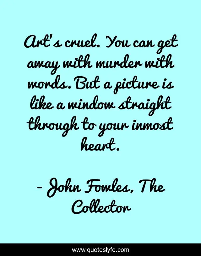 This page presents the quote "Art's cruel. You can get away with murder with words. But a picture is like a window straight through to your inmost heart.". Author of this quote is John Fowles, The Collector. This quote is about murder, art, words,.