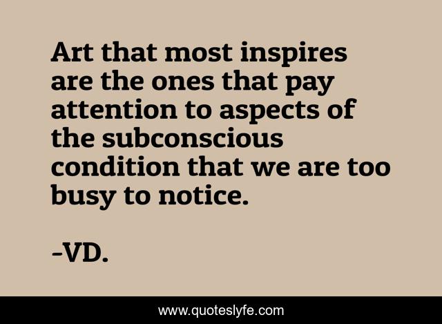 This page presents the quote "Art that most inspires are the ones that pay attention to aspects of the subconscious condition that we are too busy to notice.". Author of this quote is VD.. This quote is about enthusiasm, art, inspirational,.
