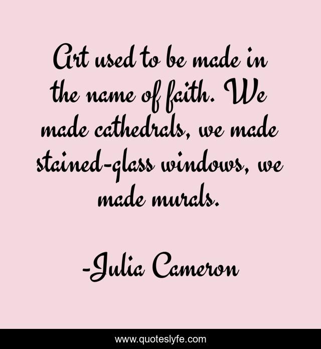 This page presents the quote "Art used to be made in the name of faith. We made cathedrals, we made stained-glass windows, we made murals.". Author of this quote is Julia Cameron. This quote is about windows, art, name,.