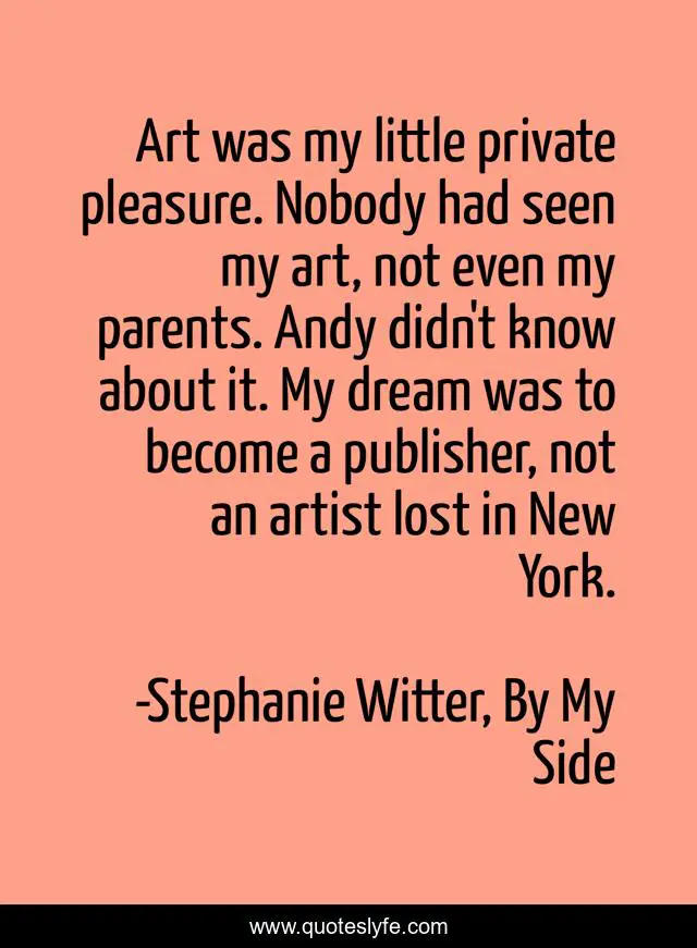 This page presents the quote "Art was my little private pleasure. Nobody had seen my art, not even my parents. Andy didn't know about it. My dream was to become a publisher, not an artist lost in New York.". Author of this quote is Stephanie Witter, By My Side. This quote is about young-adult, contemporary-romance,.