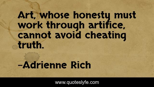 This page presents the quote "Art, whose honesty must work through artifice, cannot avoid cheating truth.". Author of this quote is Adrienne Rich. This quote is about work, art, honesty,.