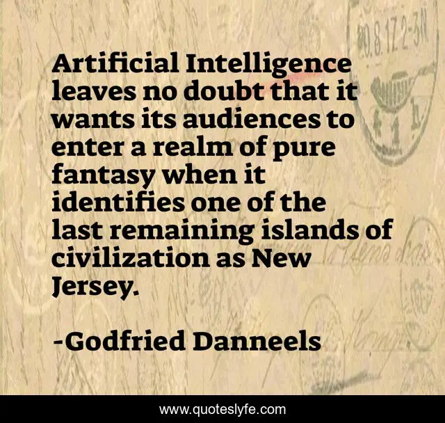 This page presents the quote "Artificial Intelligence leaves no doubt that it wants its audiences to enter a realm of pure fantasy when it identifies one of the last remaining islands of civilization as New Jersey.". Author of this quote is Godfried Danneels. This quote is about new, doubt, fantasy,.