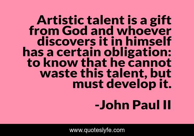 This page presents the quote "Artistic talent is a gift from God and whoever discovers it in himself has a certain obligation: to know that he cannot waste this talent, but must develop it.". Author of this quote is John Paul II. This quote is about art, talent,.