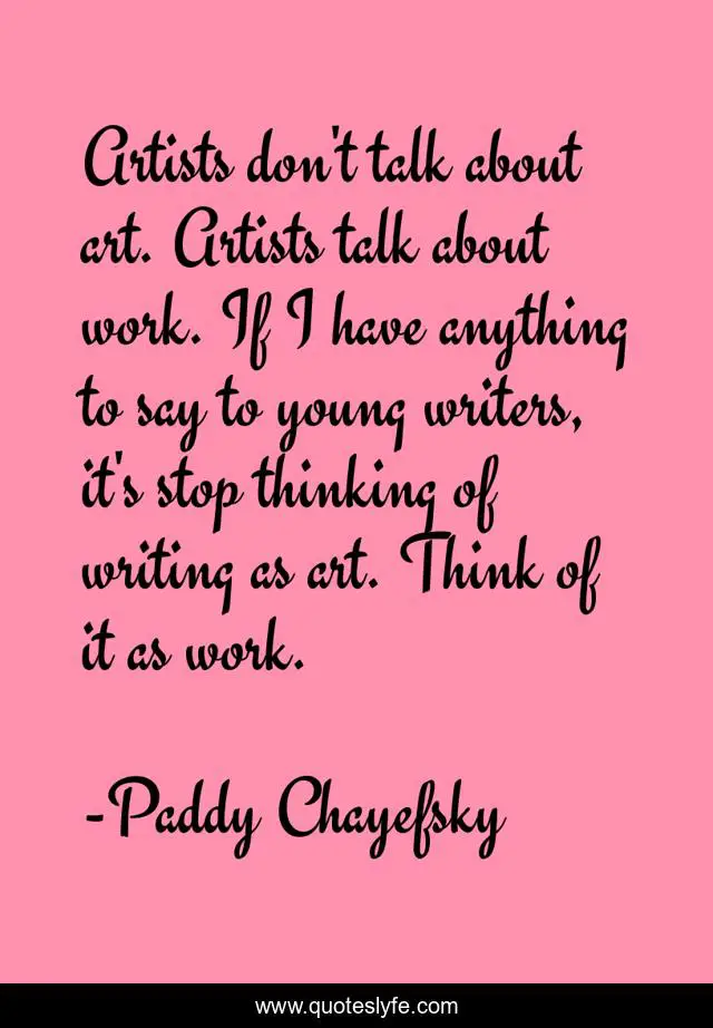 This page presents the quote "Artists don't talk about art. Artists talk about work. If I have anything to say to young writers, it's stop thinking of writing as art. Think of it as work.". Author of this quote is Paddy Chayefsky. This quote is about thinking, work, writing,.