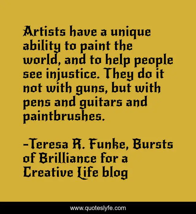 This page presents the quote "Artists have a unique ability to paint the world, and to help people see injustice. They do it not with guns, but with pens and guitars and paintbrushes.". Author of this quote is Teresa R. Funke, Bursts of Brilliance for a Creative Life blog. This quote is about role-of-artists, revolution, justice, paint, music, injustice, guitars, artists, passion,.