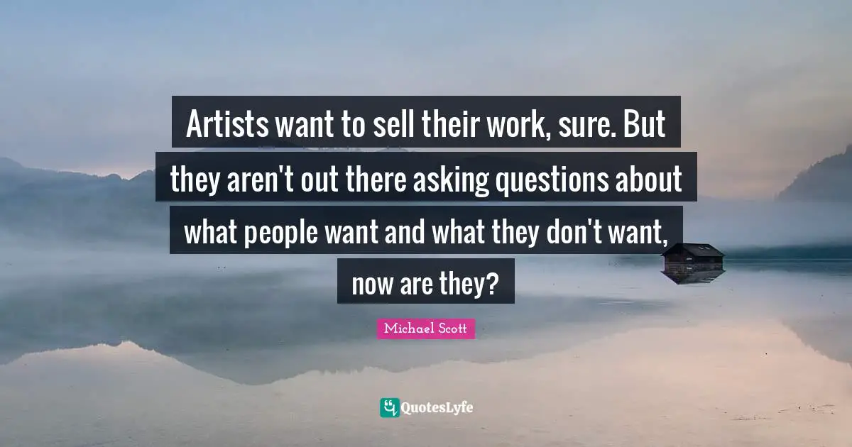 This page presents the quote "Artists want to sell their work, sure. But they aren't out there asking questions about what people want and what they don't want, now are they?". Author of this quote is Michael Scott. This quote is about work, people, asking questions, artist,.