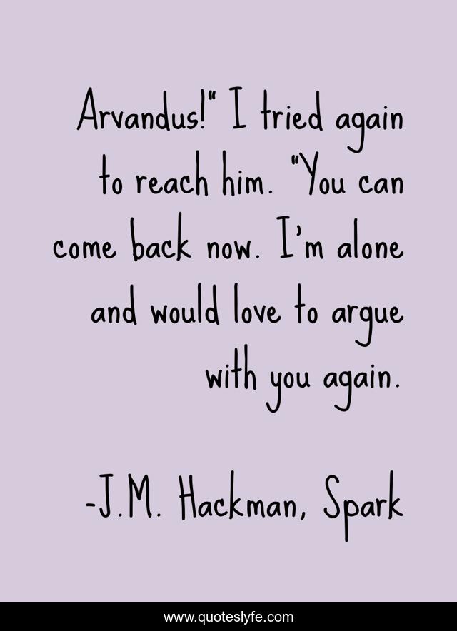 This page presents the quote "Arvandus!" I tried again to reach him. "You can come back now. I'm alone and would love to argue with you again.". Author of this quote is J.M. Hackman, Spark. This quote is about adventure-fantasy, friendship,.