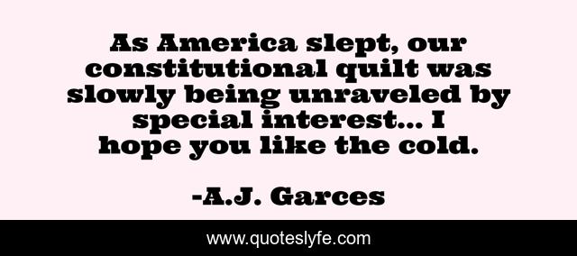 This page presents the quote "As America slept, our constitutional quilt was slowly being unraveled by special interest... I hope you like the cold.". Author of this quote is A.J. Garces. This quote is about political-commentary, political-philosophy, life-lessons,.