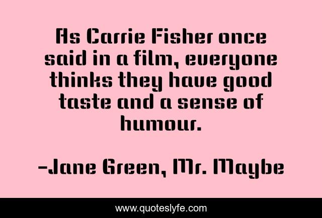 This page presents the quote "As Carrie Fisher once said in a film, everyone thinks they have good taste and a sense of humour.". Author of this quote is Jane Green, Mr. Maybe. This quote is about sense-of-humor, movies, good-taste,.