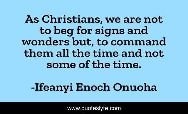 This page presents the quote "As Christians, we are not to beg for signs and wonders but, to command them all the time and not some of the time.". Author of this quote is Ifeanyi Enoch Onuoha. This quote is about life, christian, positive, higherlife-coach, motivational, confidence, ifeanyi-enoch-onuoha, optimistic, inspirational,.