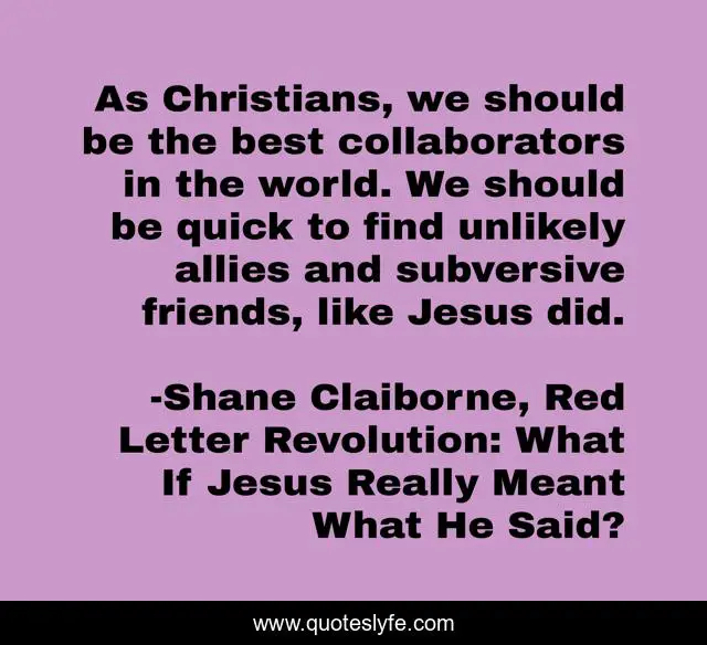 This page presents the quote "As Christians, we should be the best collaborators in the world. We should be quick to find unlikely allies and subversive friends, like Jesus did.". Author of this quote is Shane Claiborne, Red Letter Revolution: What If Jesus Really Meant What He Said?. This quote is about working-together, allies, collaboration, christianity, subversion, jesus, friends, christians,.