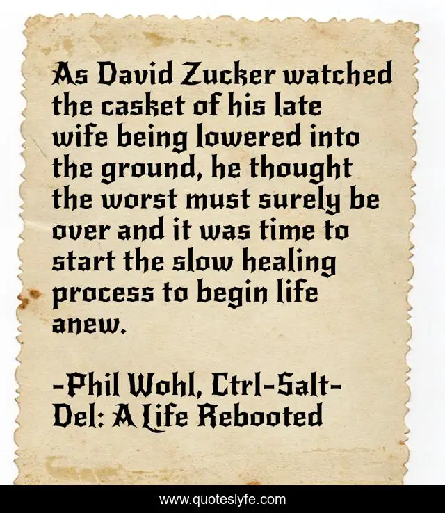 This page presents the quote "As David Zucker watched the casket of his late wife being lowered into the ground, he thought the worst must surely be over and it was time to start the slow healing process to begin life anew.". Author of this quote is Phil Wohl, Ctrl-Salt-Del: A Life Rebooted. This quote is about rebirth, death-of-a-loved-one, love-story, renewal,.