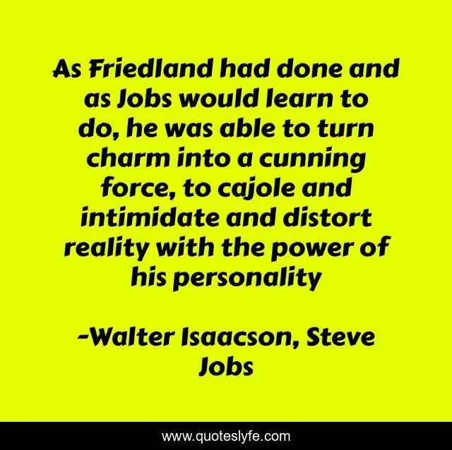 This page presents the quote "As Friedland had done and as Jobs would learn to do, he was able to turn charm into a cunning force, to cajole and intimidate and distort reality with the power of his personality". Author of this quote is Walter Isaacson, Steve Jobs. .