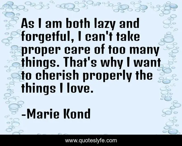 This page presents the quote "As I am both lazy and forgetful, I can't take proper care of too many things. That's why I want to cherish properly the things I love.". Author of this quote is Marie Kondō. This quote is about simplicity, tidy, forgetfulness, simplify, clutter, decluttering,.