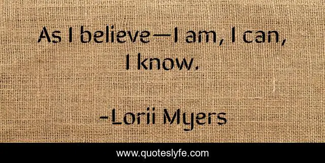 This page presents the quote "As I believe—I am, I can, I know.". Author of this quote is Lorii Myers. This quote is about confidence, knowledge, belief, confidence-and-attitude, wisdom-in-fiction, confidence-building, belief-in-yourself, knowledge-education, wisdom-inspirational,.