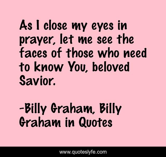 This page presents the quote "As I close my eyes in prayer, let me see the faces of those who need to know You, beloved Savior.". Author of this quote is Billy Graham, Billy Graham in Quotes. This quote is about billy-graham, prayer,.