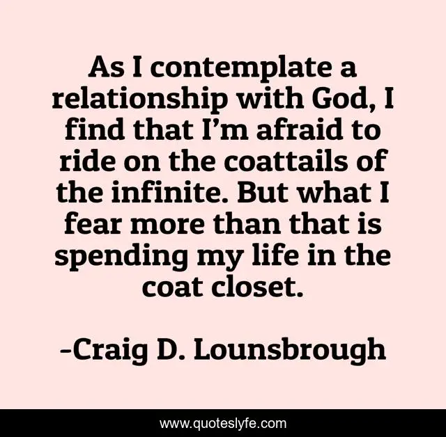 This page presents the quote "As I contemplate a relationship with God, I find that I’m afraid to ride on the coattails of the infinite. But what I fear more than that is spending my life in the coat closet.". Author of this quote is Craig D. Lounsbrough. This quote is about jesus-christ, partnership, jesus, contemplation, surrendered, partner, fear, frightened, mediocre,.