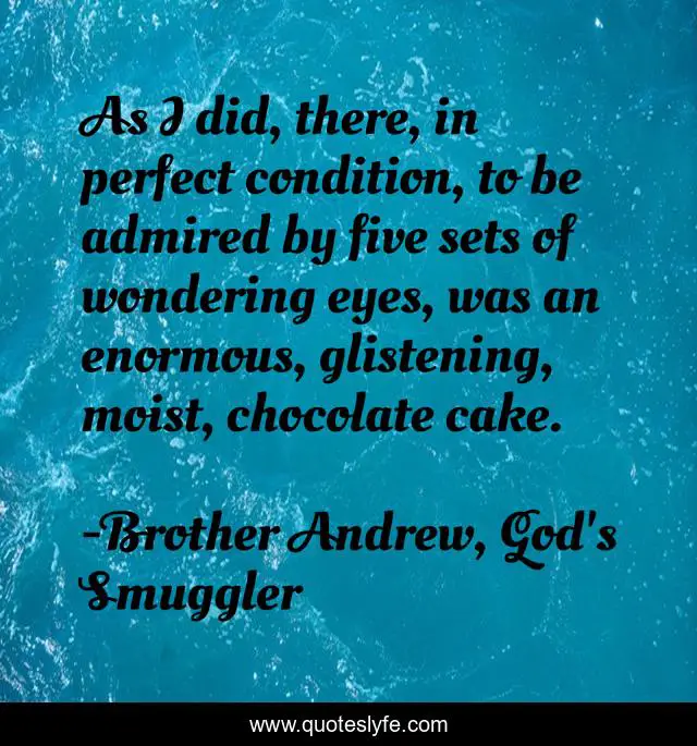 This page presents the quote "As I did, there, in perfect condition, to be admired by five sets of wondering eyes, was an enormous, glistening, moist, chocolate cake.". Author of this quote is Brother Andrew, God's Smuggler. This quote is about miracles, providence, trust, provision,.