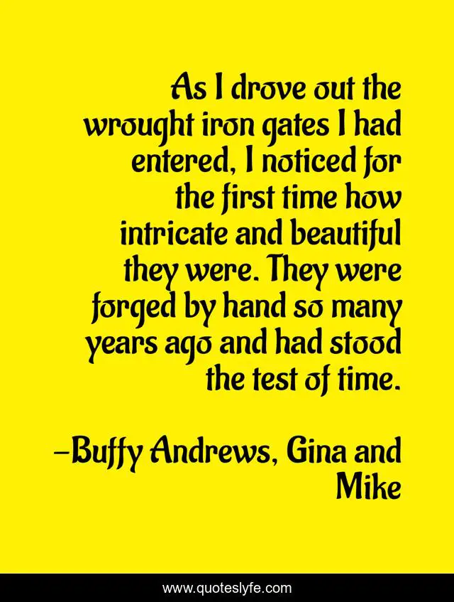 This page presents the quote "As I drove out the wrought iron gates I had entered, I noticed for the first time how intricate and beautiful they were. They were forged by hand so many years ago and had stood the test of time.". Author of this quote is Buffy Andrews, Gina and Mike. This quote is about yearbook-series, book, writers, writers-world, gina-and-mike,.