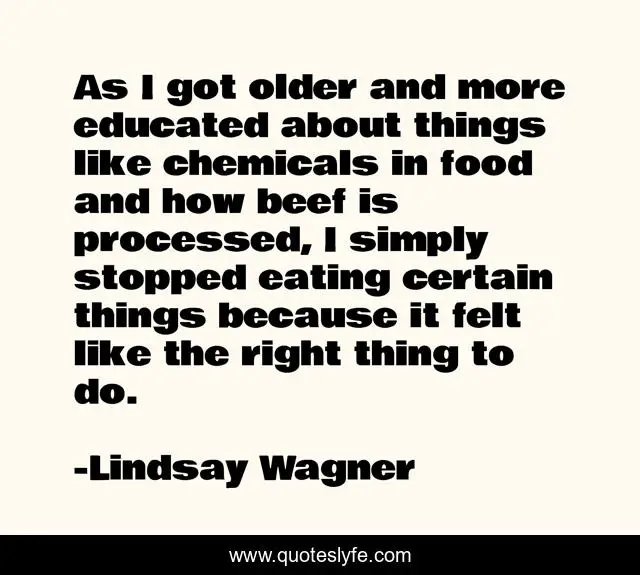 This page presents the quote "As I got older and more educated about things like chemicals in food and how beef is processed, I simply stopped eating certain things because it felt like the right thing to do.". Author of this quote is Lindsay Wagner. This quote is about the right thing, eating,.