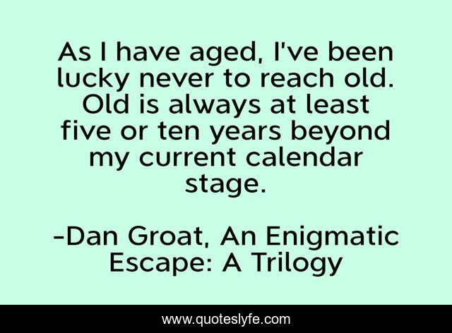 This page presents the quote "As I have aged, I’ve been lucky never to reach old. Old is always at least five or ten years beyond my current calendar stage.". Author of this quote is Dan Groat, An Enigmatic Escape: A Trilogy. This quote is about aging, age, old, lucky,.