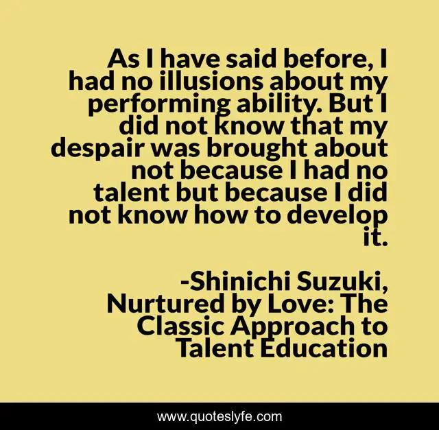 This page presents the quote "As I have said before, I had no illusions about my performing ability. But I did not know that my despair was brought about not because I had no talent but because I did not know how to develop it.". Author of this quote is Shinichi Suzuki, Nurtured by Love: The Classic Approach to Talent Education. This quote is about music, talent,.