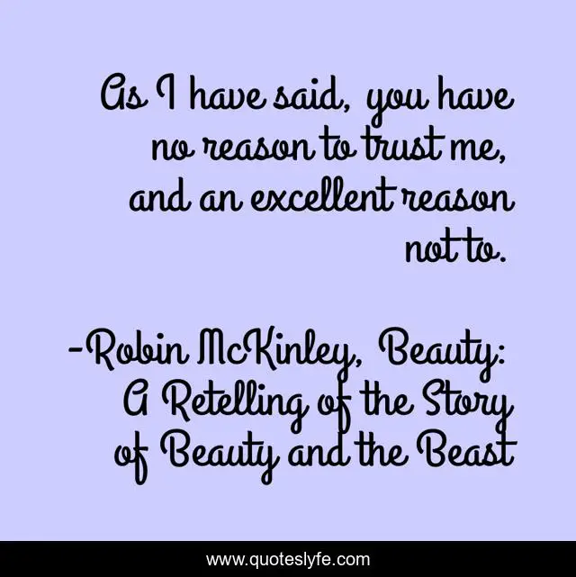 This page presents the quote "As I have said, you have no reason to trust me, and an excellent reason not to.". Author of this quote is Robin McKinley, Beauty: A Retelling of the Story of Beauty and the Beast. This quote is about love, beauty, beast, beauty-and-the-beast, trust, reasoning, affection,.