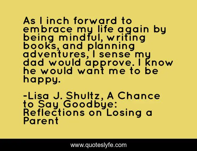 This page presents the quote "As I inch forward to embrace my life again by being mindful, writing books, and planning adventures, I sense my dad would approve. I know he would want me to be happy.". Author of this quote is Lisa J. Shultz, A Chance to Say Goodbye: Reflections on Losing a Parent. This quote is about dad, writing-books, mindful, planning-ahead, embrace-life, happy,.
