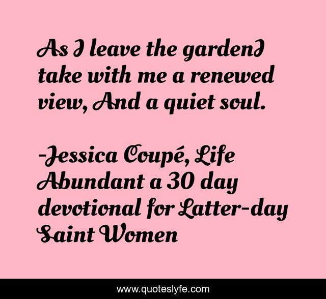 "Jessica Coupé, Life Abundant a 30 day devotional for Latter-day Saint Women Quotes." Quoteslyfe.com, 2025. Fri. 05 Dec. 2025. <https://www.quoteslyfe.com/quote/As-I-leave-the-gardenI-take-with-181414>.