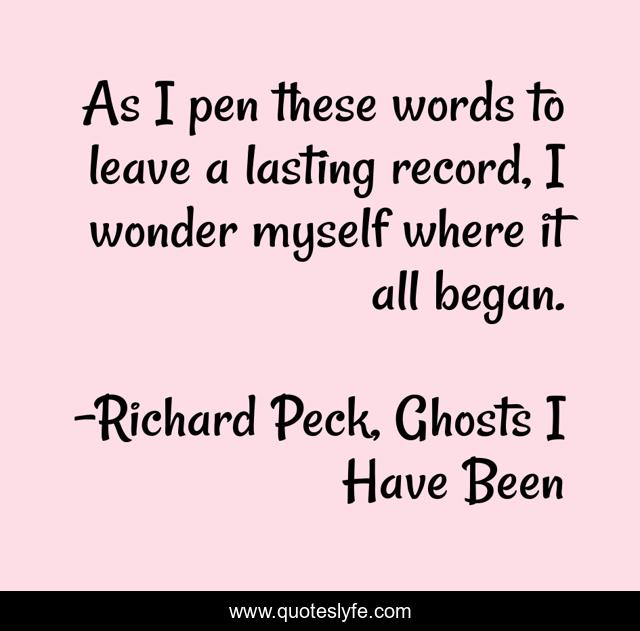 This page presents the quote "As I pen these words to leave a lasting record, I wonder myself where it all began.". Author of this quote is Richard Peck, Ghosts I Have Been. This quote is about second-sight, began, girls, fiction, pen, truth, prologue, ghosts, lasting,.