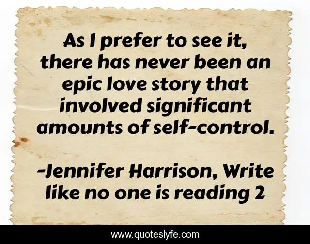 This page presents the quote "As I prefer to see it, there has never been an epic love story that involved significant amounts of self-control.". Author of this quote is Jennifer Harrison, Write like no one is reading 2. This quote is about story, love, love-story, self-control, epic-love, epic, affection,.