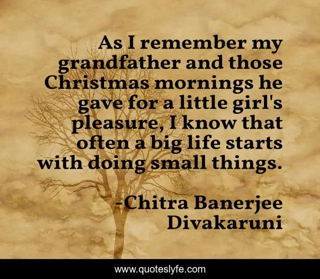 This page presents the quote "As I remember my grandfather and those Christmas mornings he gave for a little girl's pleasure, I know that often a big life starts with doing small things.". Author of this quote is Chitra Banerjee Divakaruni. This quote is about small things, life, girl,.