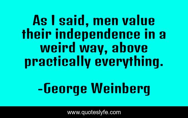 This page presents the quote "As I said, men value their independence in a weird way, above practically everything.". Author of this quote is George Weinberg. This quote is about weird, men, value,.