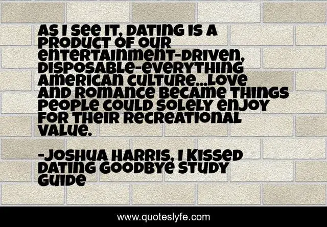 This page presents the quote "As I see it, dating is a product of our entertainment-driven, disposable-everything American culture...Love and romance became things people could solely enjoy for their recreational value.". Author of this quote is Joshua Harris, I Kissed Dating Goodbye Study Guide. .