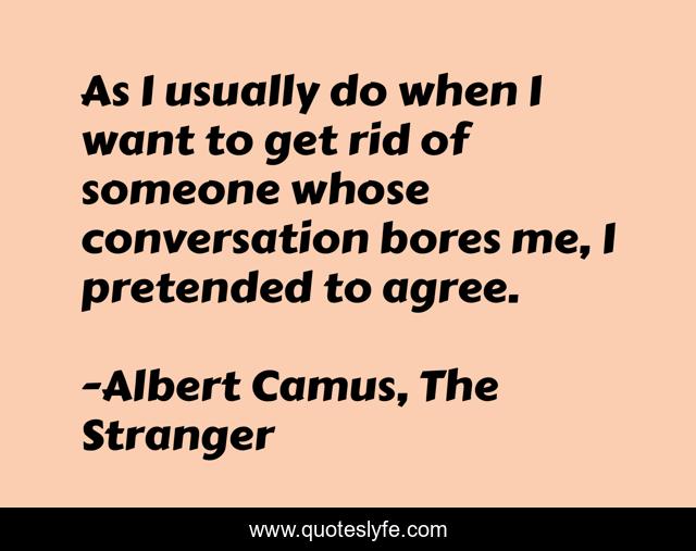 This page presents the quote "As I usually do when I want to get rid of someone whose conversation bores me, I pretended to agree.". Author of this quote is Albert Camus, The Stranger. This quote is about philosophical, alienation,.