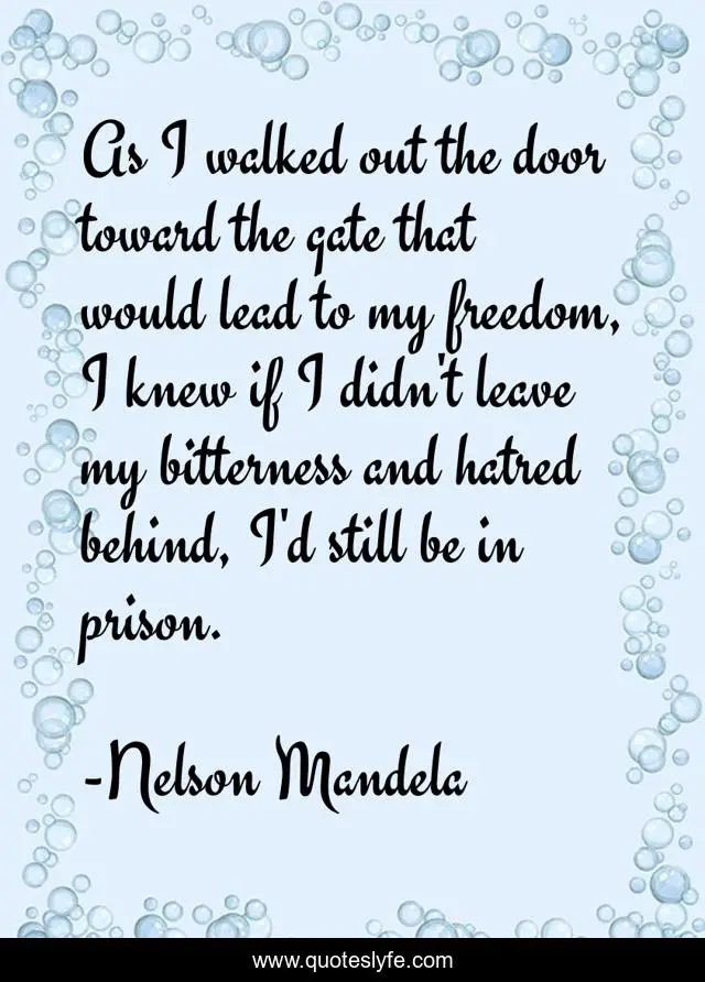 This page presents the quote "As I walked out the door toward the gate that would lead to my freedom, I knew if I didn't leave my bitterness and hatred behind, I'd still be in prison.". Author of this quote is Nelson Mandela. .