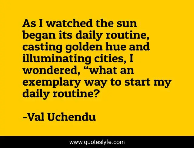 This page presents the quote "As I watched the sun began its daily routine, casting golden hue and illuminating cities, I wondered, “what an exemplary way to start my daily routine?". Author of this quote is Val Uchendu. This quote is about confidence, positive, motivational, daily, optimistic, inspirational, enthusiasm, routine-of-daily-life, sunrise,.