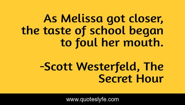 This page presents the quote "As Melissa got closer, the taste of school began to foul her mouth.". Author of this quote is Scott Westerfeld, The Secret Hour. This quote is about scott-westerfeld, school, midnighters, humor,.