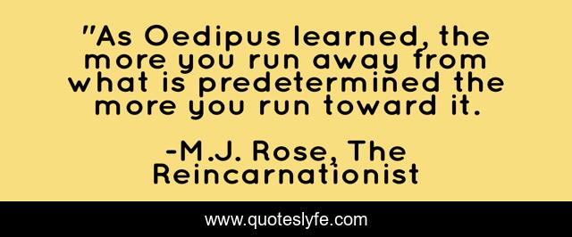 This page presents the quote ""As Oedipus learned, the more you run away from what is predetermined the more you run toward it.". Author of this quote is M.J. Rose, The Reincarnationist. .