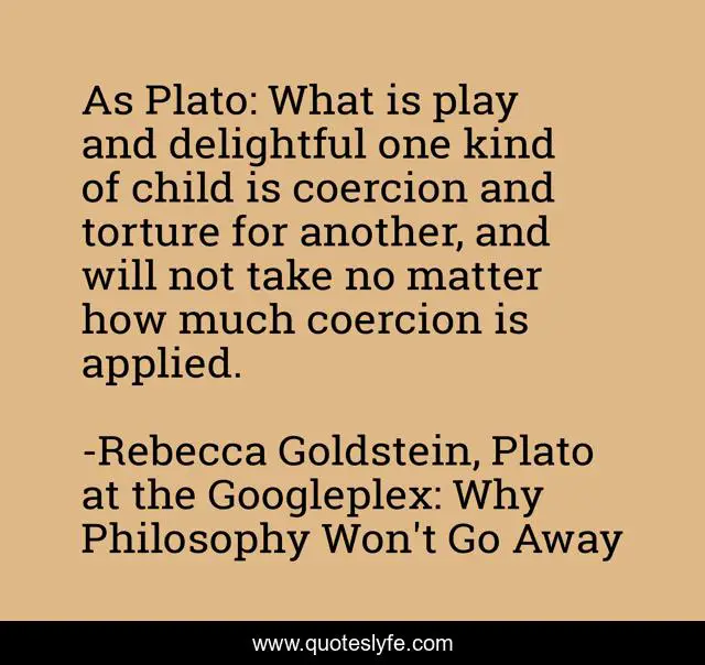 This page presents the quote "As Plato: What is play and delightful one kind of child is coercion and torture for another, and will not take no matter how much coercion is applied.". Author of this quote is Rebecca Goldstein, Plato at the Googleplex: Why Philosophy Won't Go Away. This quote is about parenting, education, character,.