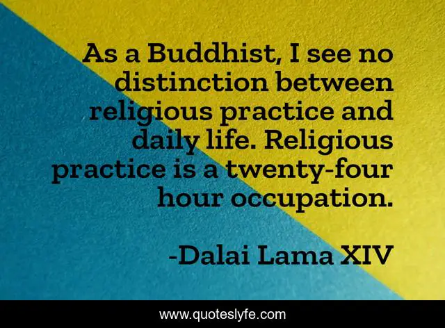 This page presents the quote "As a Buddhist, I see no distinction between religious practice and daily life. Religious practice is a twenty-four hour occupation.". Author of this quote is Dalai Lama XIV. This quote is about daily-life, buddhist, religious-practices,.