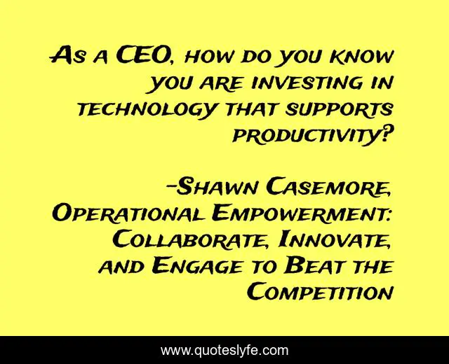 This page presents the quote "As a CEO, how do you know you are investing in technology that supports productivity?". Author of this quote is Shawn Casemore, Operational Empowerment: Collaborate, Innovate, and Engage to Beat the Competition. This quote is about ceo, productivity, technology,.