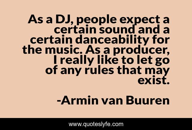 This page presents the quote "As a DJ, people expect a certain sound and a certain danceability for the music. As a producer, I really like to let go of any rules that may exist.". Author of this quote is Armin van Buuren. This quote is about rules, dj, people,.
