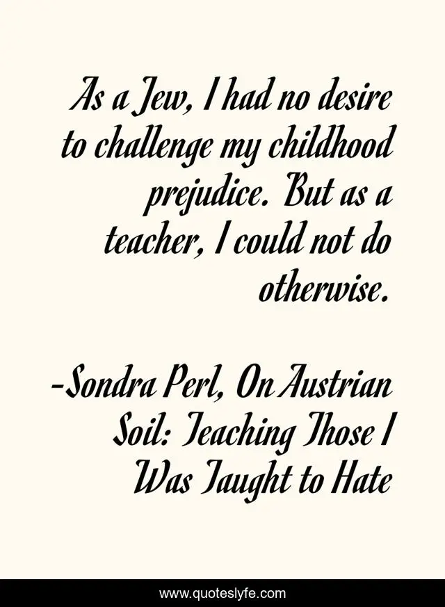 This page presents the quote "As a Jew, I had no desire to challenge my childhood prejudice. But as a teacher, I could not do otherwise.". Author of this quote is Sondra Perl, On Austrian Soil: Teaching Those I Was Taught to Hate. This quote is about teaching, prejudice, teacher,.