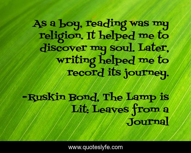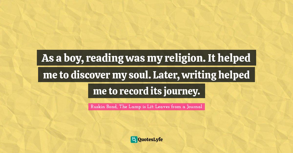 This page presents the quote "As a boy, reading was my religion. It helped me to discover my soul. Later, writing helped me to record its journey.". Author of this quote is Ruskin Bond, The Lamp is Lit: Leaves from a Journal. This quote is about record, soul, writing, religion, journey, reading, discovery,.