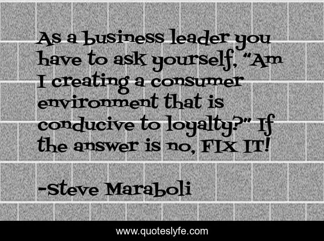This page presents the quote "As a business leader you have to ask yourself, “Am I creating a consumer environment that is conducive to loyalty?” If the answer is no, FIX IT!". Author of this quote is Steve Maraboli. This quote is about consumer, leader, business, loyalty,.