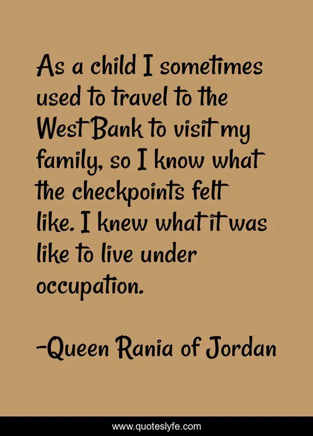 This page presents the quote "As a child I sometimes used to travel to the West Bank to visit my family, so I know what the checkpoints felt like. I knew what it was like to live under occupation.". Author of this quote is Queen Rania of Jordan. This quote is about live, family, child,.