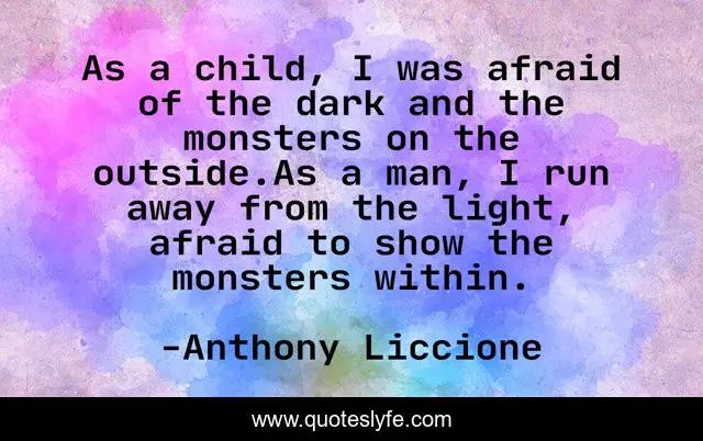 This page presents the quote "As a child, I was afraid of the dark and the monsters on the outside.As a man, I run away from the light, afraid to show the monsters within.". Author of this quote is Anthony Liccione. This quote is about dark, light, child, afraid, man,.