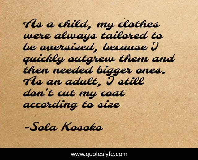 This page presents the quote "As a child, my clothes were always tailored to be oversized, because I quickly outgrew them and then needed bigger ones. As an adult, I still don't cut my coat according to size". Author of this quote is Sola Kosoko. This quote is about rags-to-riches, success, positive, motivational, confidence, avant-garde, self-improvement, inspirational, enthusiasm,.