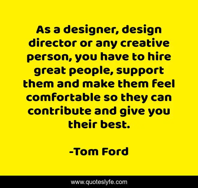 This page presents the quote "As a designer, design director or any creative person, you have to hire great people, support them and make them feel comfortable so they can contribute and give you their best.". Author of this quote is Tom Ford. This quote is about great, support, best,.
